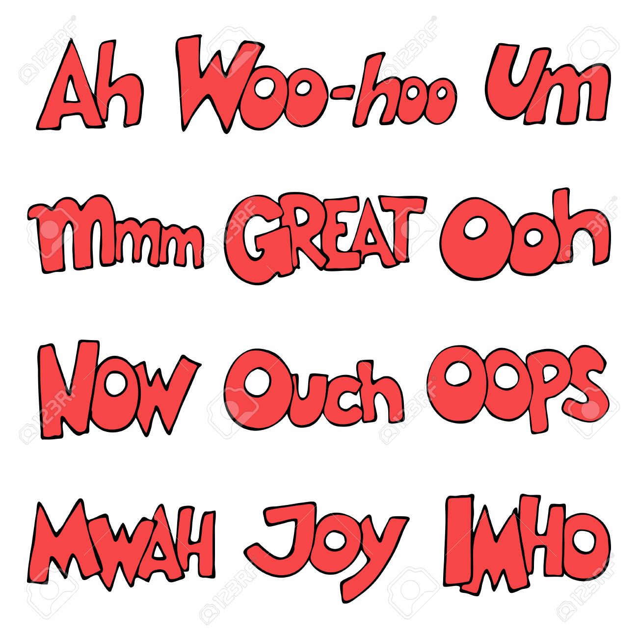 レタリング 言葉 おっと 偉大な今 Imho ウーフー うーん Mwah ええと ああ 痛い 喜び ああ 図 のイラスト素材 ベクタ Image